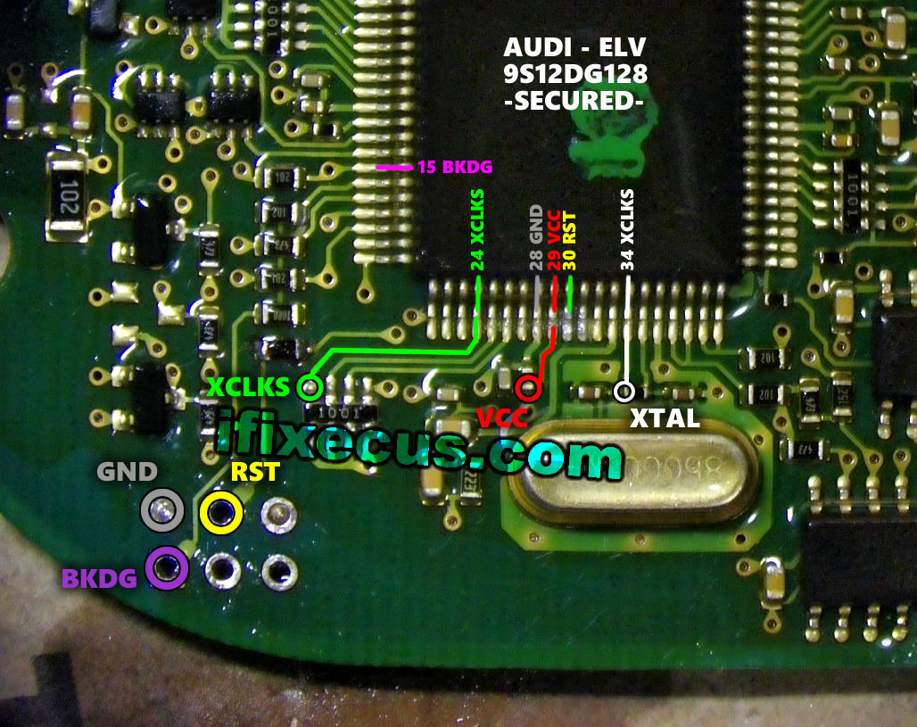 In-circuit wiring schematics for reading the 9S12DG128 (qfp80) EEPROM and flash memory in Audi A6 ELV steering lock modules. The secured chip requires a reliable programmer—my recommended tool is the original XPROG or VVDI Prog.